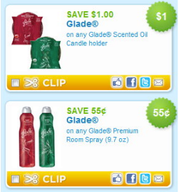 There are several new Glade printable coupons available here including $1/2 Glade Jar Candles, $1/2 Glade Scented Oil Candle Holders & $.55 Glade Premium Room Spray.